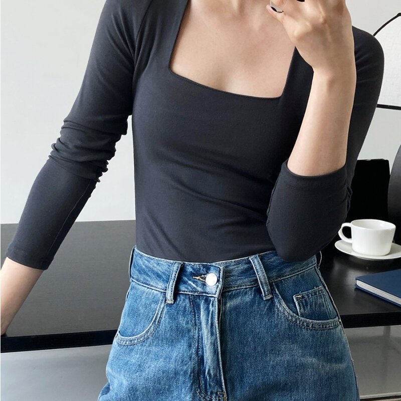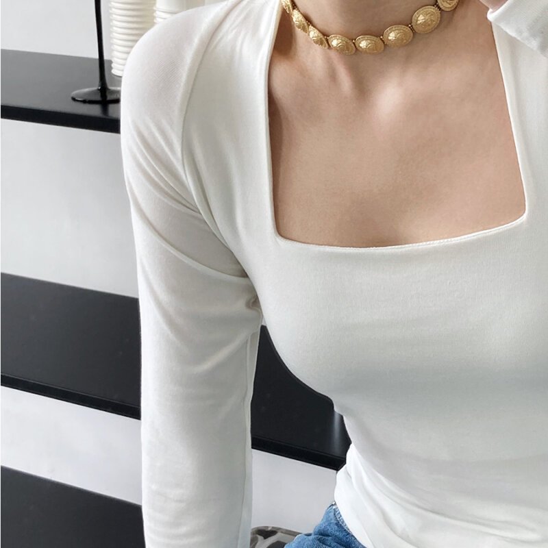 Tシャツ 女性の純粋な欲望風 フレンチスクエアネック長袖ボトムシャツブラウス