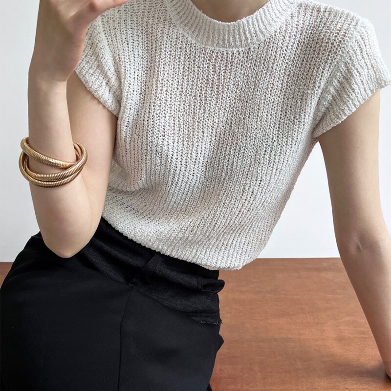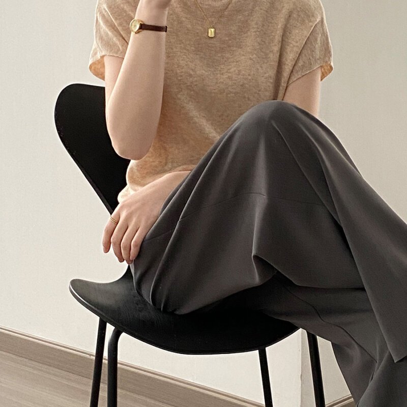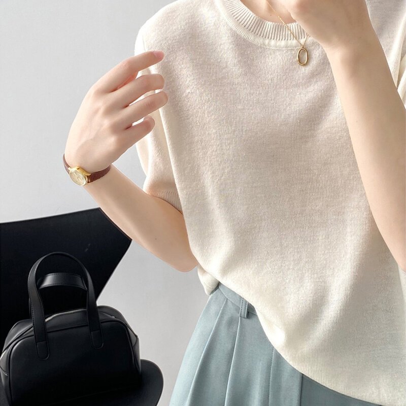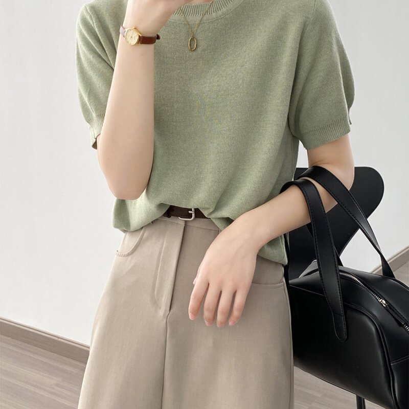 Tシャツ レディースファッション 丸首ニット半袖スリムウエストボトムトップス