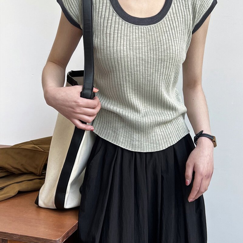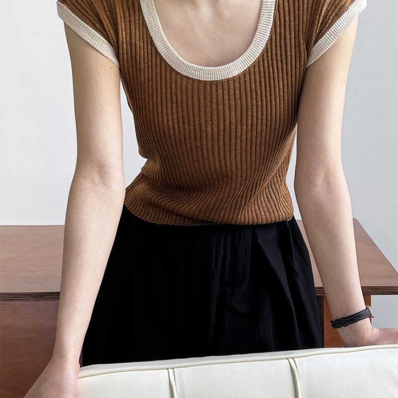 Tシャツ レディースファッション Uカラーニット半袖スリム薄手トップスモデル