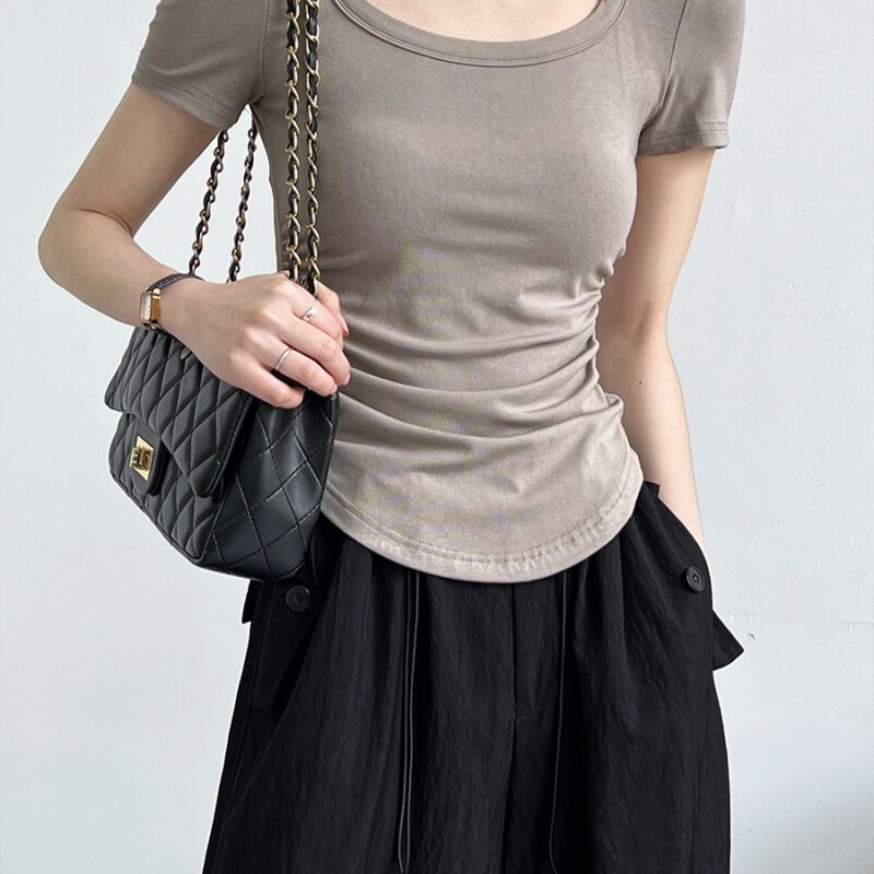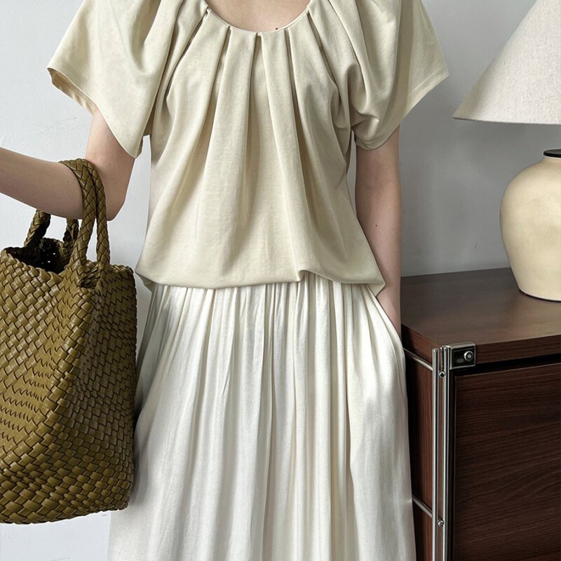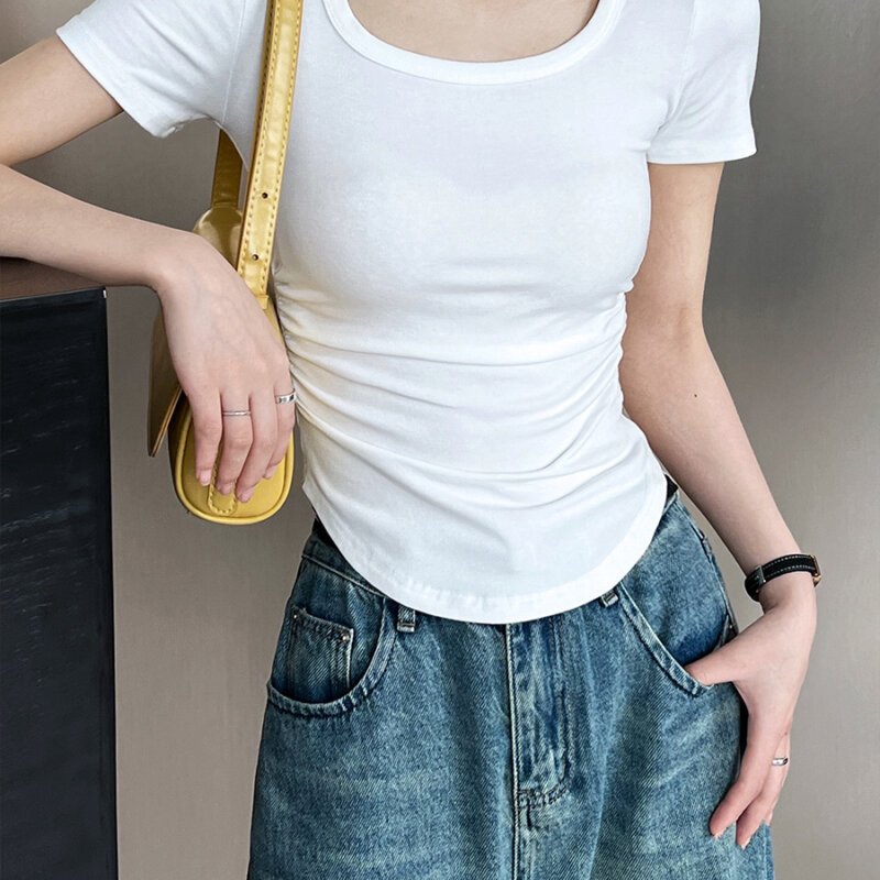 Tシャツ レディース 韓国系ファッション Uネックプリーツ韓国バブルスリーブトップス