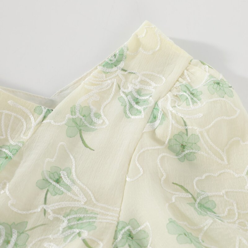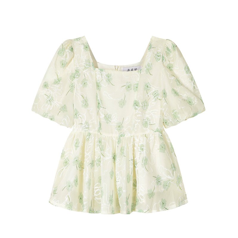 女性のブラウスフランスの半袖の花柄のウエストシャツ